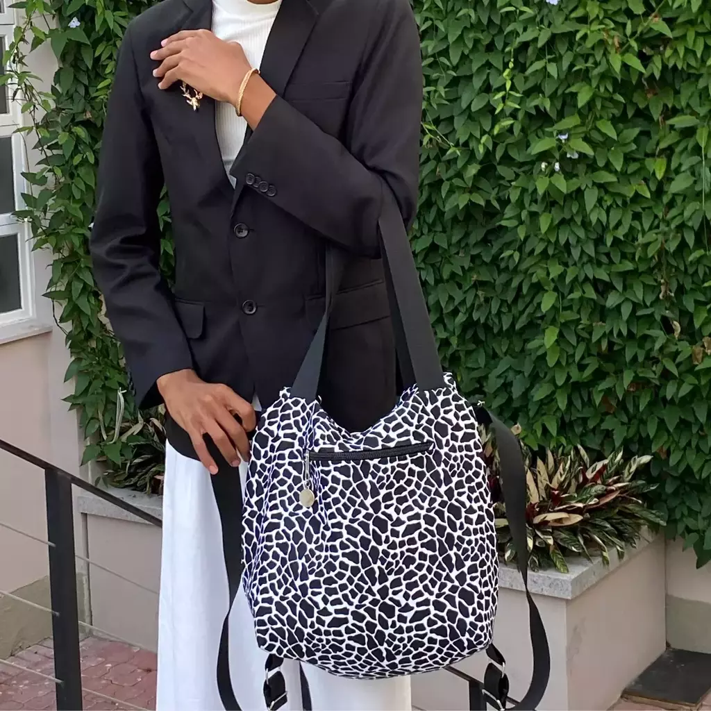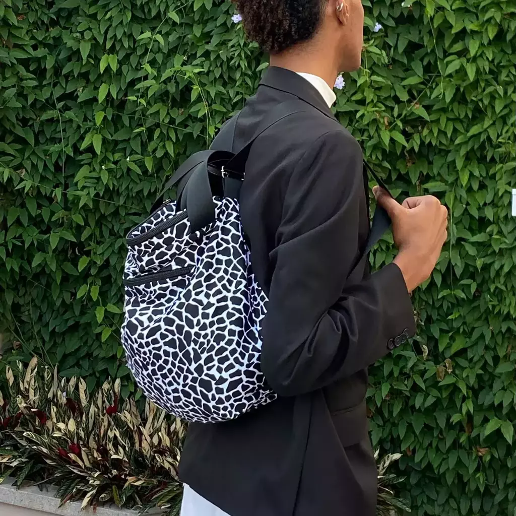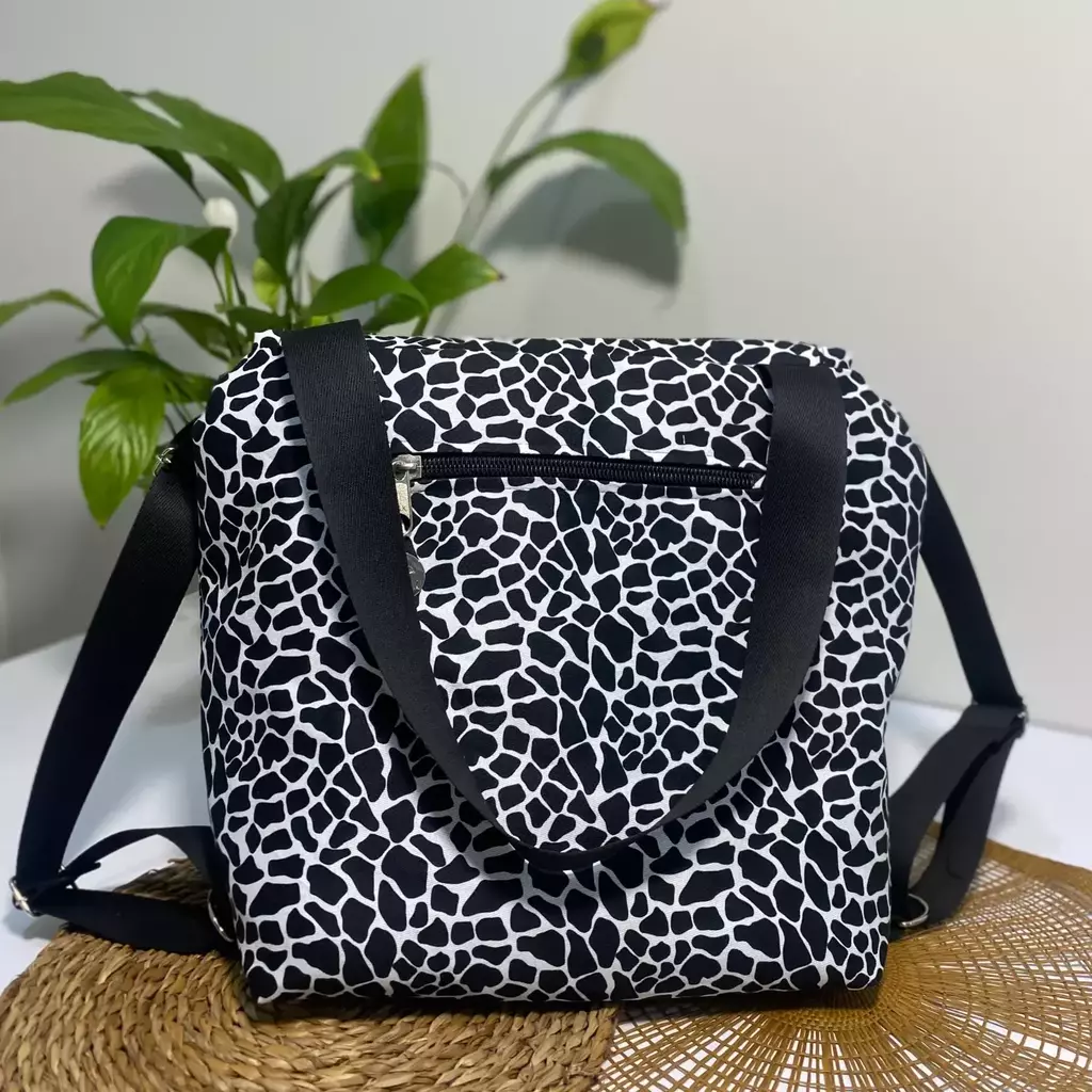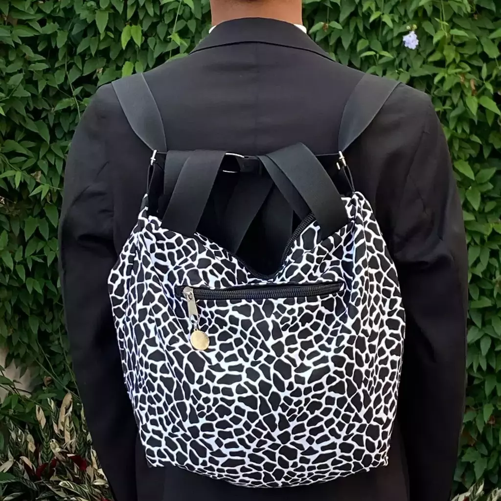 - Alças de 4 cm de largura: duas centrais para usar no ombro e duas laterais que podem ser usadas na transversal ou unidas no centro para transformar a bolsa em mochila.